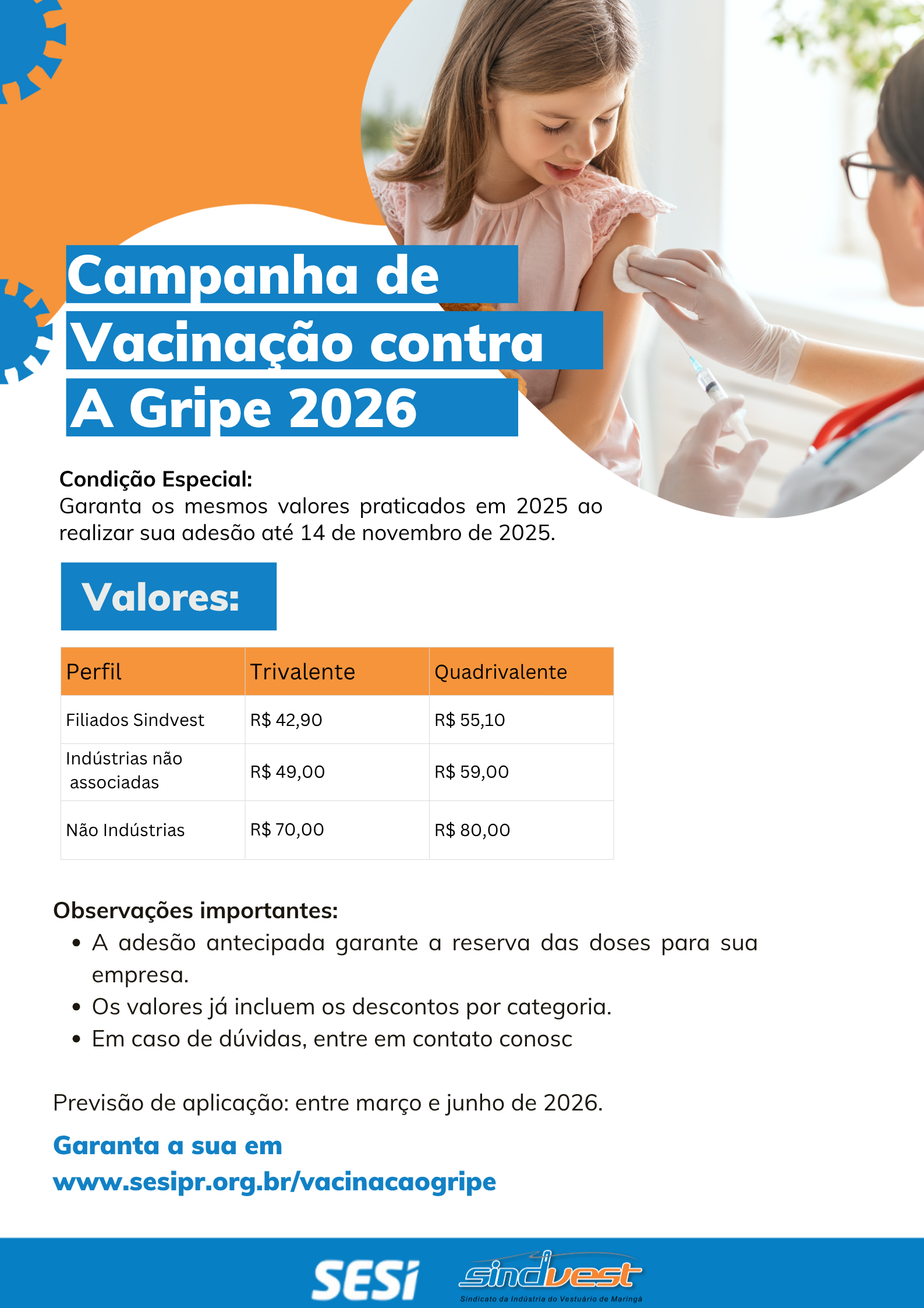 O Sindvest, em parceria com o Sesi, convida sua empresa para participar da Campanha de Vacinação Contra a Gripe 2026!