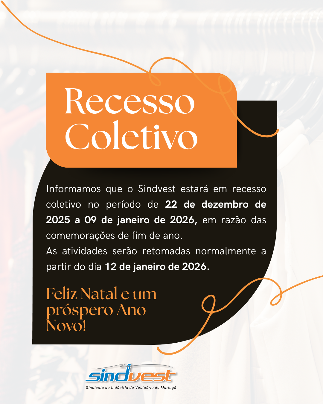 Informamos que o Sindvest estará em recesso coletivo no período de 22 de dezembro de 2025 a 09 de janeiro de 2026 , em razão das comemorações de fim de ano.